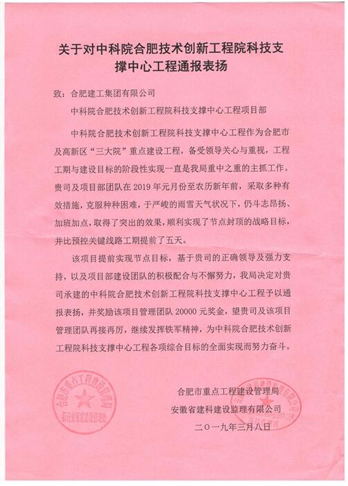 3月8日,由合肥建工六分公司施工管理的中科院合肥創新院科技支撐中心項目,受到建設單位中科院合肥技術創新工程院、合肥市重點局、安徽建科監理公司下文表彰及重金獎勵。