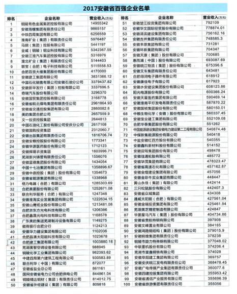據了解,此次2017安徽百強企業峰會旨在貫徹傳達中共中央、國務院下發的“營造企業家健康成長環境弘揚優秀企業家精神更好發揮企業家作用的意見”文件精神,努力實現“十三五”規劃目標,引導皖企做優做強做大。入圍企業營業收入基準是35.51億元,100強企業營業總收入達到16156.7億元。100強企業中進入全國企業500強有14家,入圍數量在中部六省中位居第一。