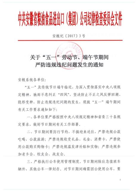 關(guān)于“五一”勞動節(jié)、端午節(jié)期間嚴(yán)防違規(guī)違紀(jì)問題發(fā)生的通知