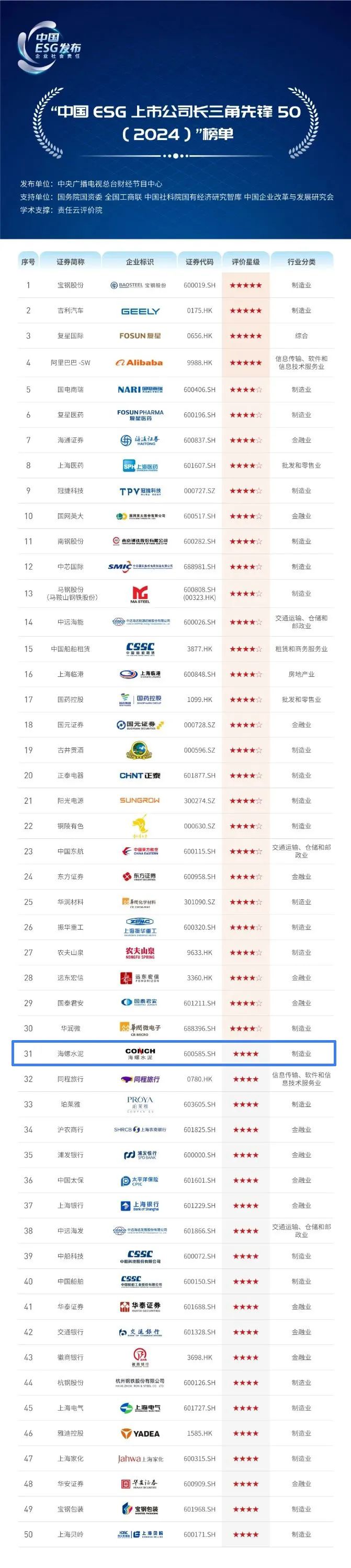 8月7日,中央廣播電視總臺《長三角ESG行動報告》正式對外發布。海螺水泥入選其中,名列第31位。